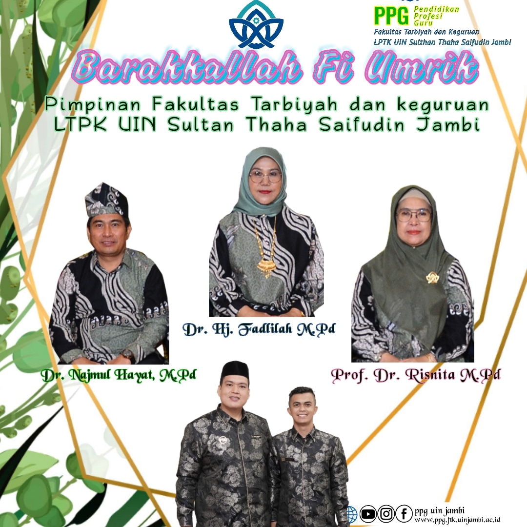 Barakkallah fi umrik Dekan Fakultas Tarbiyah dan Keguruan UIN Sultan Thaha Saifudin Jambi Dr. Hj. Fadlilah, M.Pd Wd 1 Prof. Dr. Risnita, M.Pd Wd 2 Dr. Najmul Hayat, M.Pd From Program Studi PPG LPTK Fakultas Tarbiyah dan Keguruan UIN Sultan Thaha Saifudin Jambi